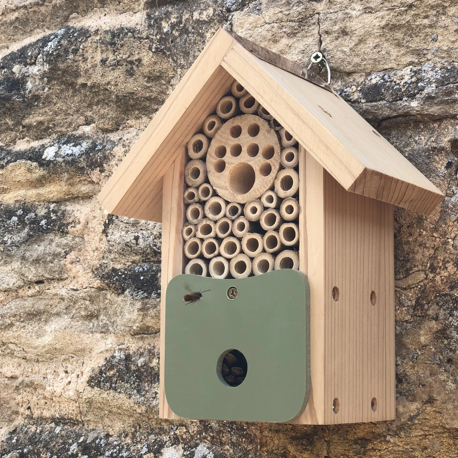Dit prachtige bijenhuis is een ideale nestel plaats voor de solitaire bijen in jouw tuin. Daarnaast trekt het huisje ook vele andere soorten bestuivers en insecten aan die allemaal een nestje kunnen maken in de verschillende secties. Het bijenhuis is gemaakt van FSC goedgekeurd hout en heeft een voorkantje van gerecycled kunststof. Hang het bijenhuis aan de muur in de richting zuid/zuidoost voor het beste resultaat!