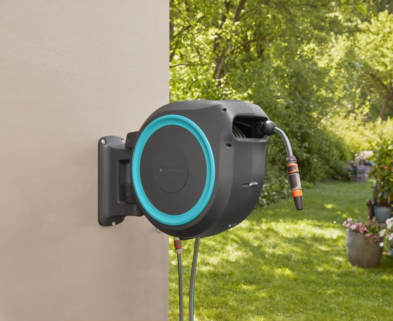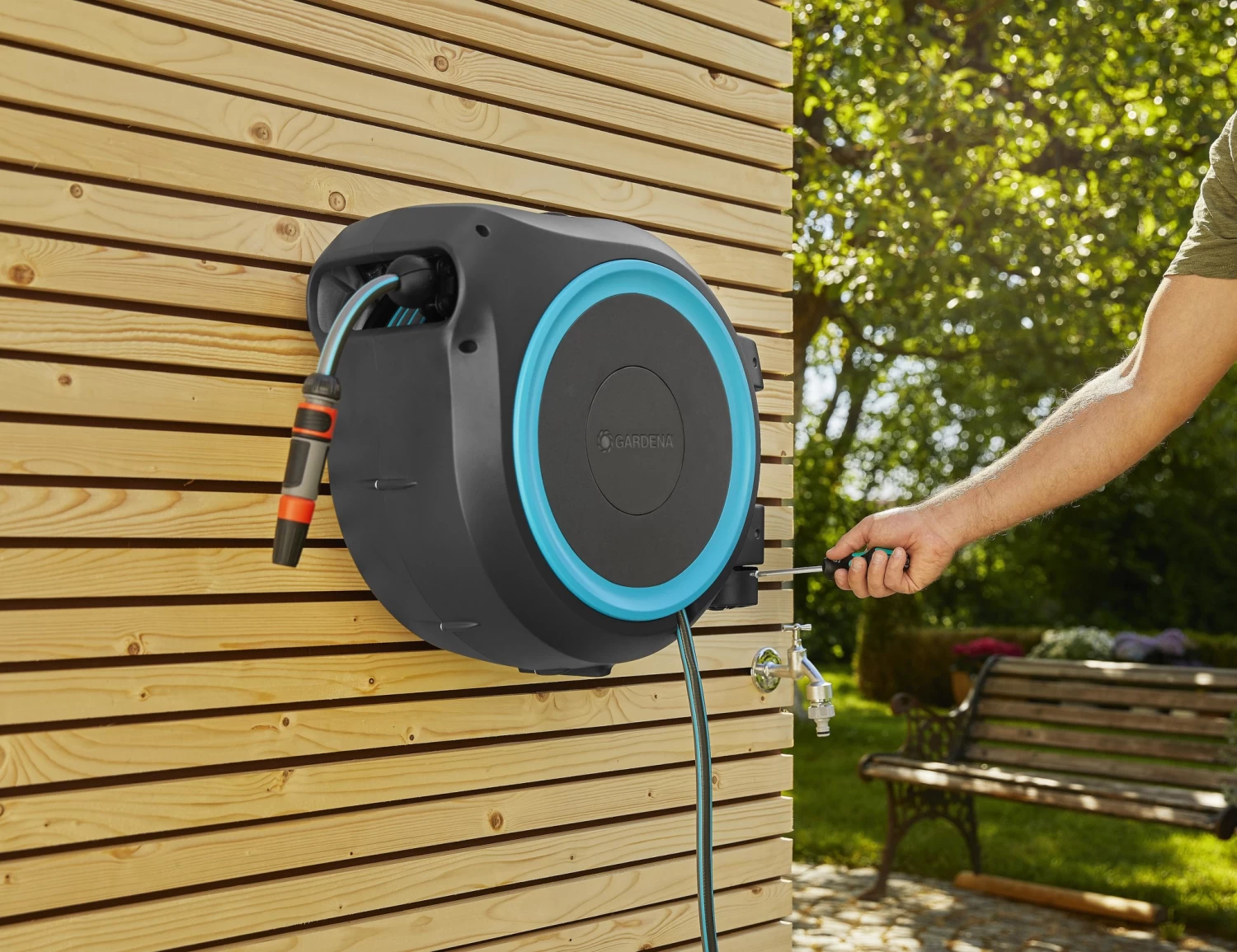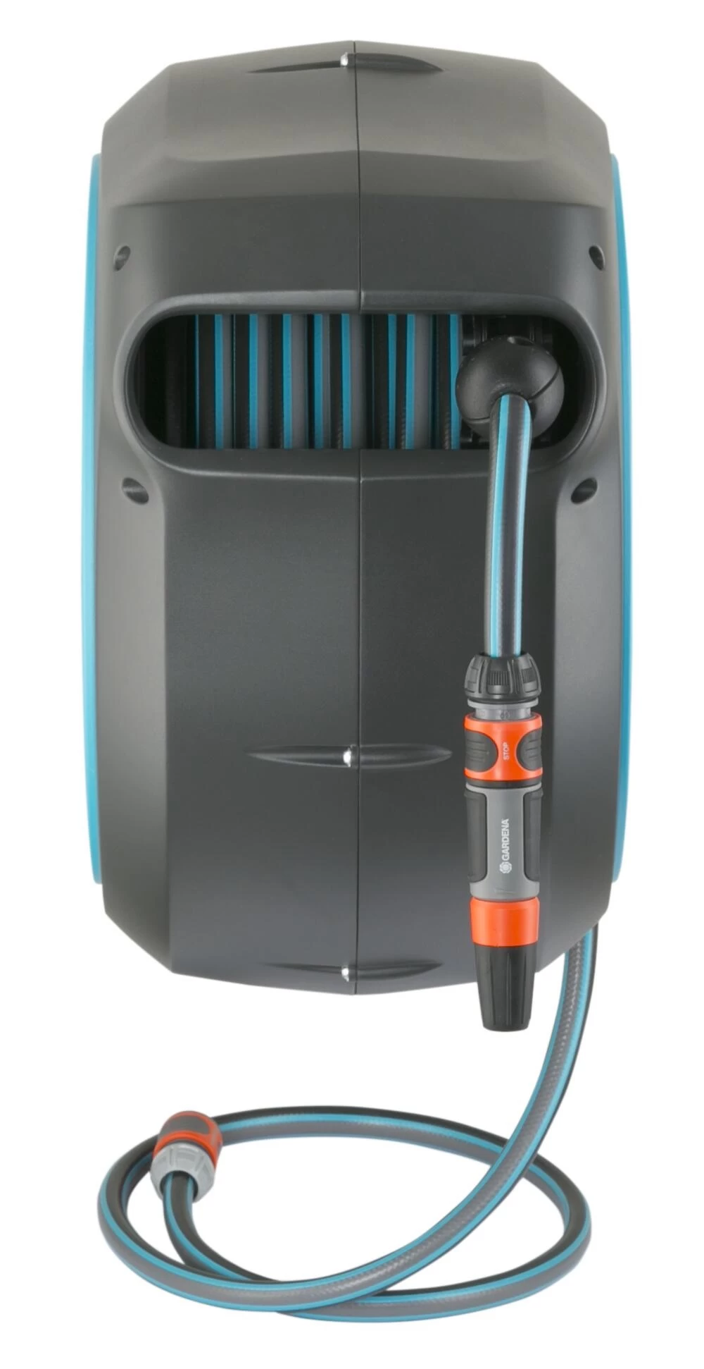 De slang rolt automatisch af als eraan wordt getrokken en wordt automatisch vergrendeld op de gewenste lengte. Door voorzichtig te trekken komt deze vergrendeling weer los en wordt de slang automatisch opgerold. Om ervoor dat dit veilig en gecontroleerd gebeurt, maakt deze wandslangenbox gebruik van de innovatieve RollControl-technologie. De geïntegreerde slanggeleider zorgt ervoor dat het oprollen van de slang netjes en gelijkmatig gebeurt, zodat er geen knopen of knikken in de slang komen. Voor diverse bewaterhulpstukken is er ruimte aan de muurbeugel, daar kun je ze opbergen zodat de slangaccessoires altijd bij de hand zijn.