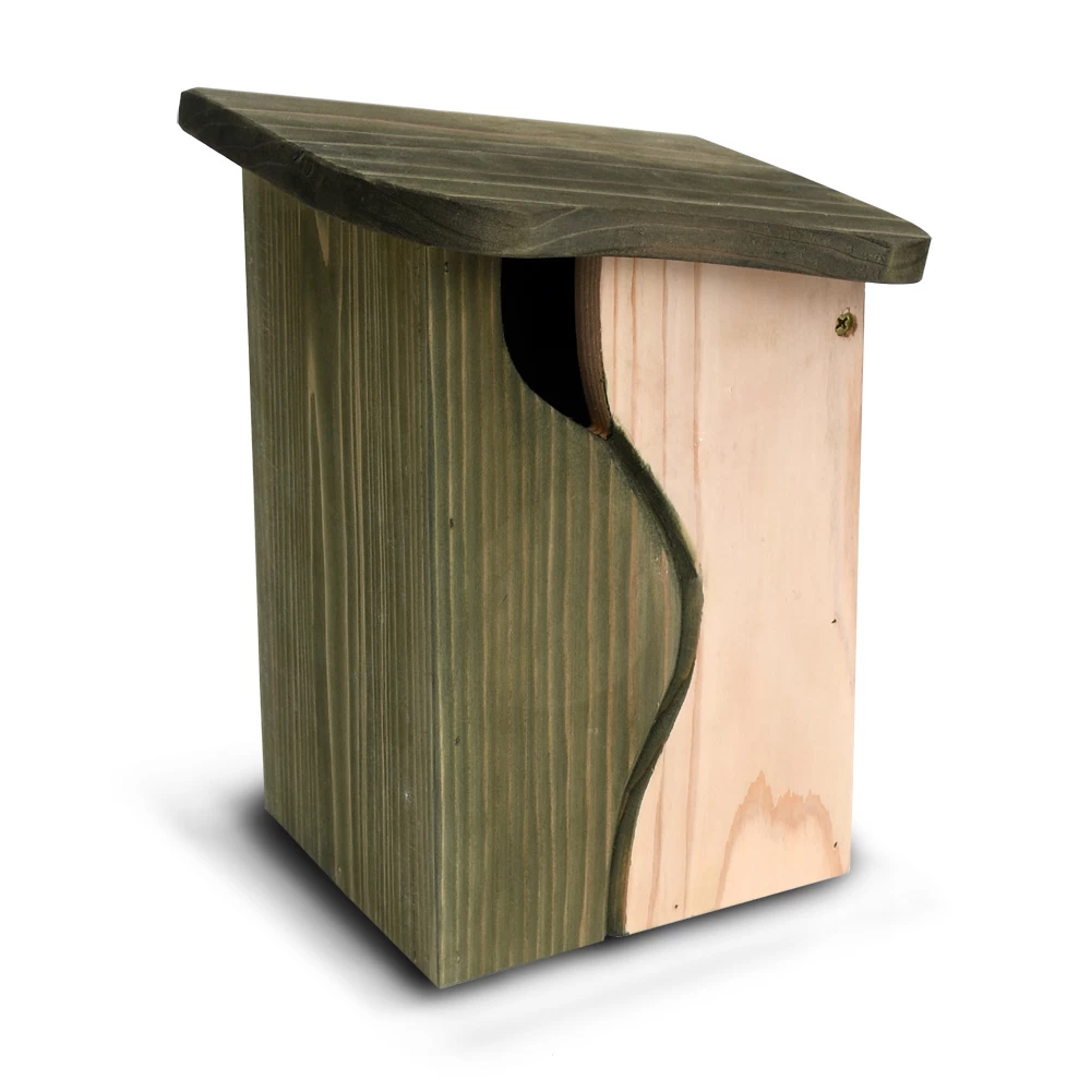 Het unieke ontwerp van deze nestkast is afkomstig van Simon King, een zeer bekende en gerespecteerde vogelkenner uit Engeland. De bochtige opening imiteert de natuurlijke opening van een oude boomstam. Dit is aantrekkelijk voor verschillende kleine soorten vogels, waaronder de meeste meessoorten, mussen en vliegenvangers etc. Het zijpaneel is eenvoudig te openen voor reiniging en het gebruikte hout is duurzaam FSC goedgekeurd. 18x13x26 cm
