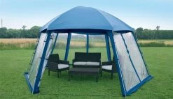 Dit poolhouse van polyester met een constructie van fiberglas en gegalvaniseerd staal biedt een uitstekende bescherming tegen de zon, maar ook tegen de regen, voorkomt vervuiling van het bad en zorgt voor een snellere opwarming van het water. De drie deuren kunnen worden gesloten m.b.v. ritsen en de overkapping is voorzien van een grondanker. Voor zwembaden met een doorsnee tot 400 cm. Afmeting: 433x500x250 cm.