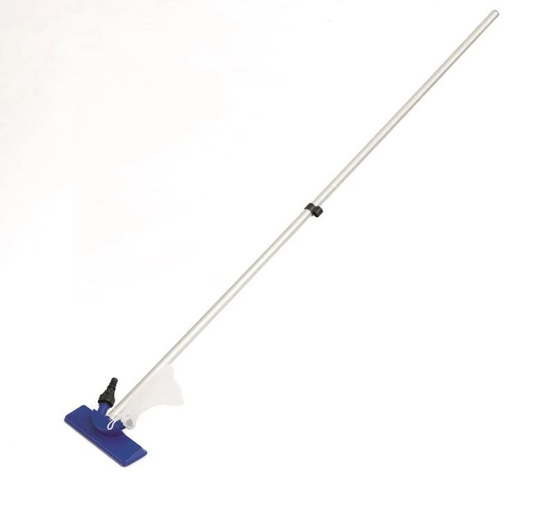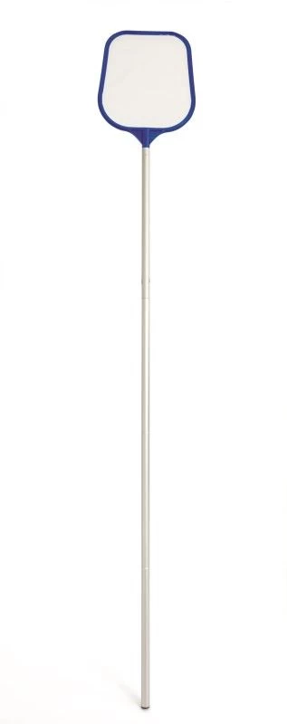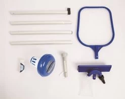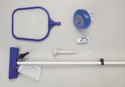 Complete schoonmaakset, aanbevolen voor zwembaden met max. Ø 366 cm. Set bestaat uit: bodemstofzuiger met opvangnet en aansluiting voor tuinslang, skimmernet, steel (in 4 delen), drijvende thermometer, chloordrijver en test strips. Ook met reparatie patch. Totale lengte steel: 172 cm.