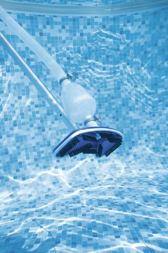 Luxe schoonmaakset van duurzaam, corrosiebestendig kunststof. Incl. telescoopsteel (tot 279 cm), herbruikbare opvangzak en extra lange slang: 7,5 m, aansluiting 32 mm. Verwijdert drijvende vuildeeltjes enz. van wanden en bodem. De borstel kan aangesloten worden op de filterpomp. Incl. oppervlaktenet voor de handmatige reiniging van grove vuildeeltjes als b.v. bladeren. Heeft een pomp nodig van minimaal 3 m³/u. Niet voor stalen wand zwembaden.