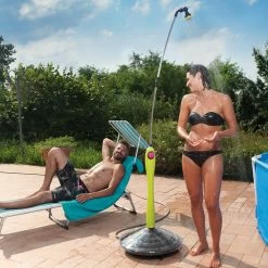 De Sunny Style buitendouche zorgt voor de beste manier om na het zwemmen of een uurtje zonnen lekker af te spoelen. Dit kan zelfs met warm water! Het waterreservoir aan de onderkant van de douche wordt namelijk verwarmd door de energie/warmte van de zon. Dit kost ongeveer 2 uur. Met behulp van een knop op de douche kan zo de perfecte temperatuur worden geregeld. Het reservoir warmt namelijk op tot 60 graden en kan wanneer het goed gemixt worden met koud water uit een aangesloten slang zorgen voor 60 liter water van 30 graden.