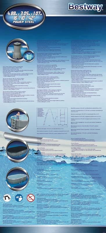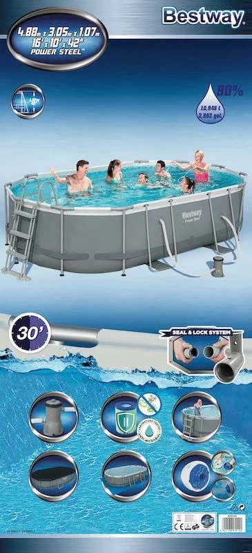 Dit zwembad zet je eenvoudig zonder extra gereedschap op. Het stalen frame is corrosiebestendig. Het zwembad is voorzien van een 3-laagse PVC band. Hierdoor staat het zwembad zeer stabiel. Je kunt dus prima flinke golven maken in dit zwembad zonder dat je hiermee het bad beschadigt. Dankzij het meegeleverde filter blijft het water fris en helder.